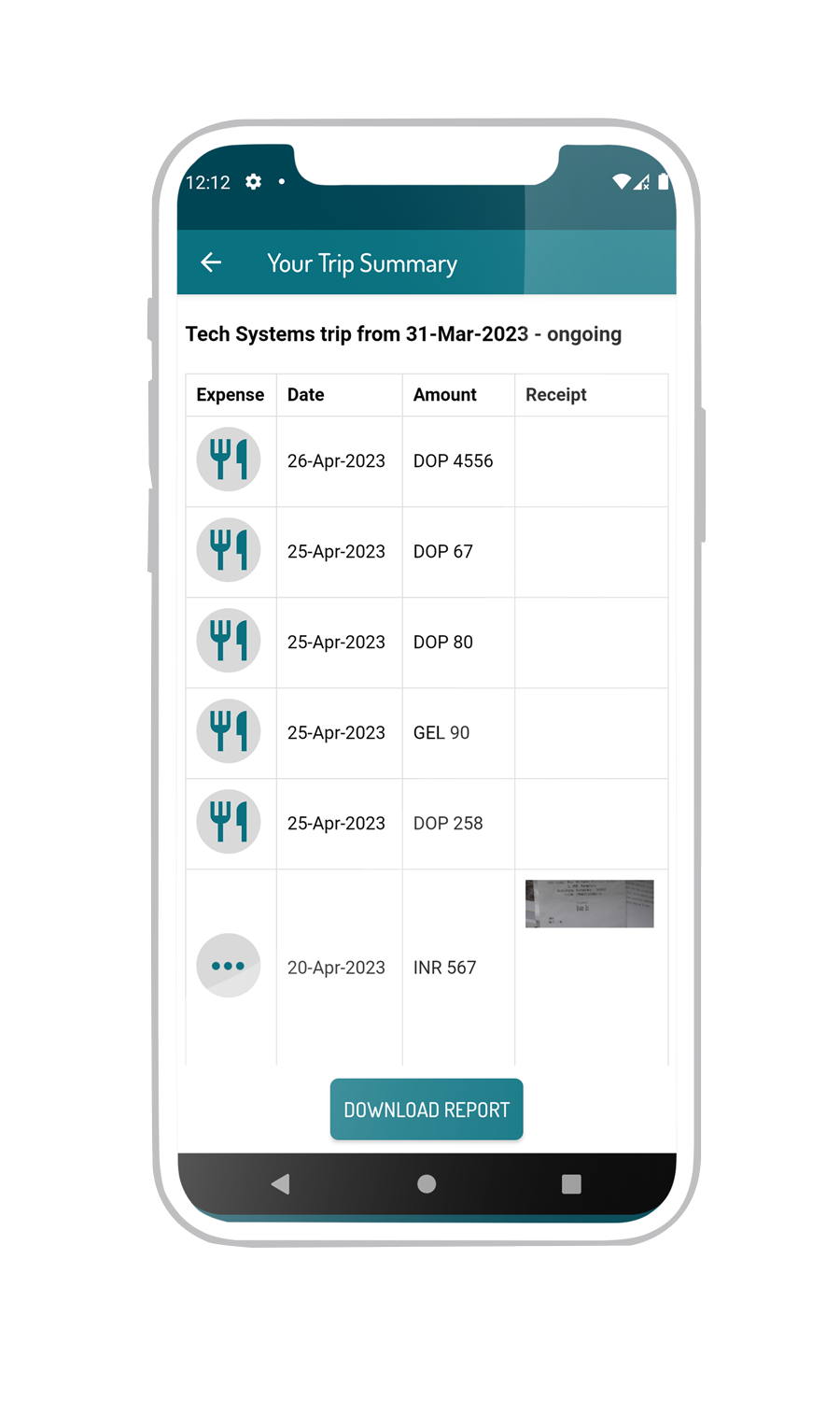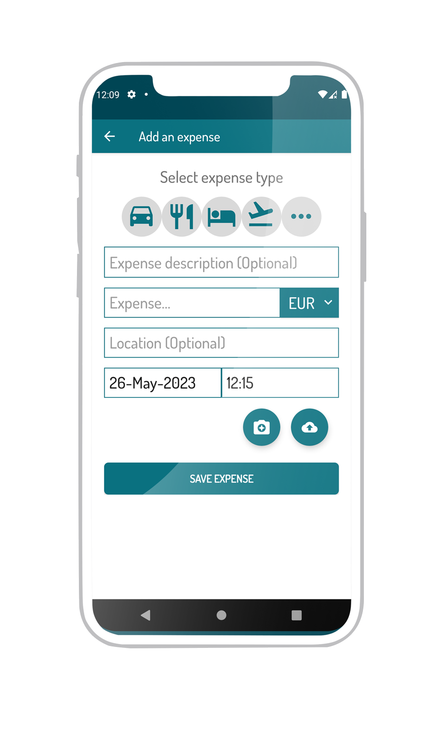 Create expense then and there by entering details or smart-scanning a receipt. The expenses can be edited and include expense categories, timestamp, optional location.